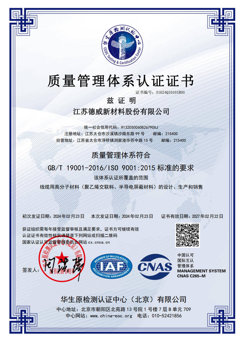 江蘇德威 ISO 9001 證書